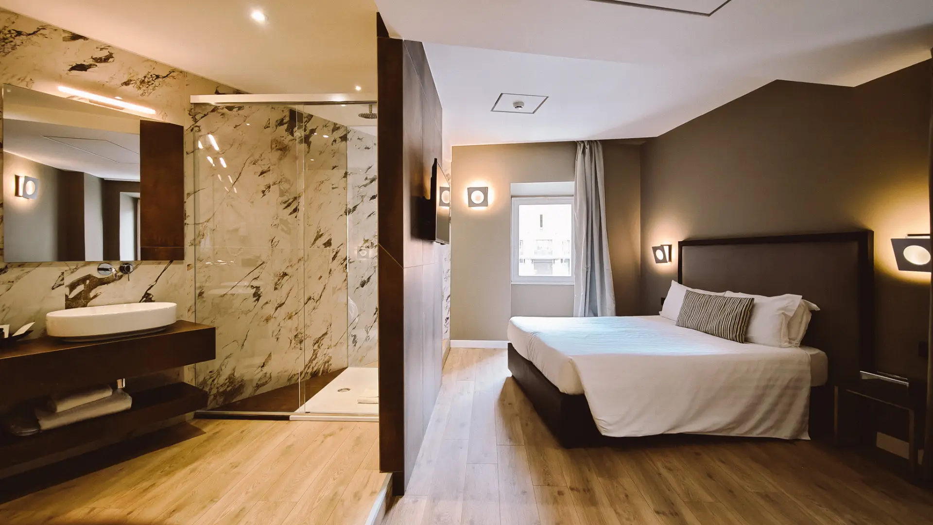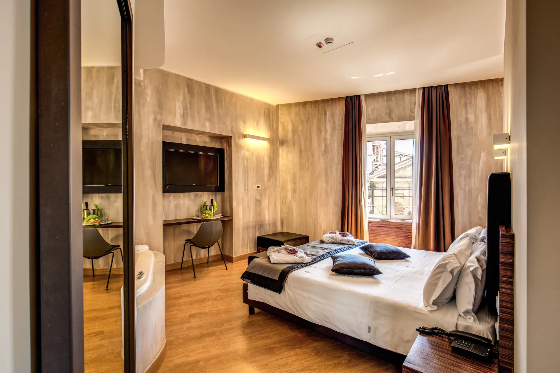The rooms of the Rome Art Hotel They were created under the unmistakable signature of design that now distinguishes all the Trevi Hotels Group properties. The simple elegance of the noble materials used expresses, with its stark beauty, a style that inspires relaxation, where the refinement of the modern furnishings and the spacious rooms and bathrooms invite well-being of body and mind. The large windows filter natural light from outside, which permeates and warms all the interior spaces.